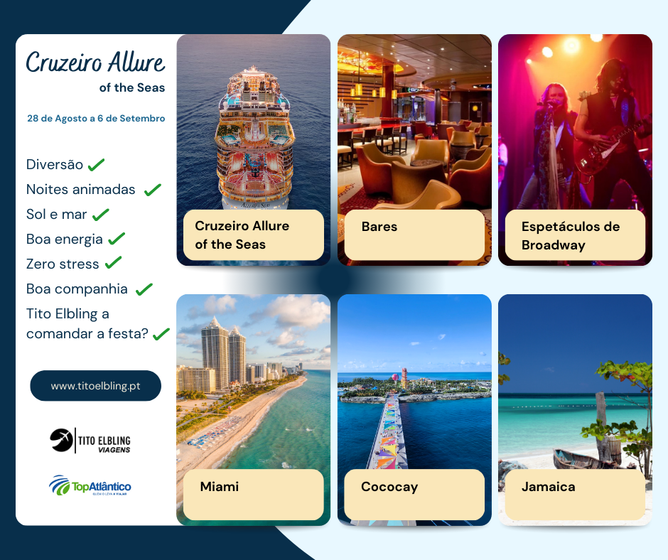 Há viagens que são férias… e há viagens que são um upgrade à vida. Esta é daquelas que te fazem sorrir só de pensar: Miami, Bahamas, Jamaica, Haiti… e um dos navios mais icónicos do mundo. Tudo isto com um grupo, descontraído e acompanhado pelo Tito Elbling.